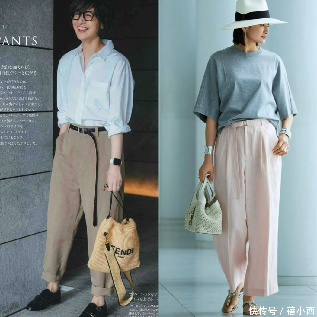 具体搭配的时候,上半身选择略宽松的纯色衬衫或短袖,下半身会搭配修身的直筒裤或烟管裤,并用腰带轻轻勒出腰线;如果穿阔腿裤或A字裙,上半身就会选合身的上衣,避免整体膨胀。